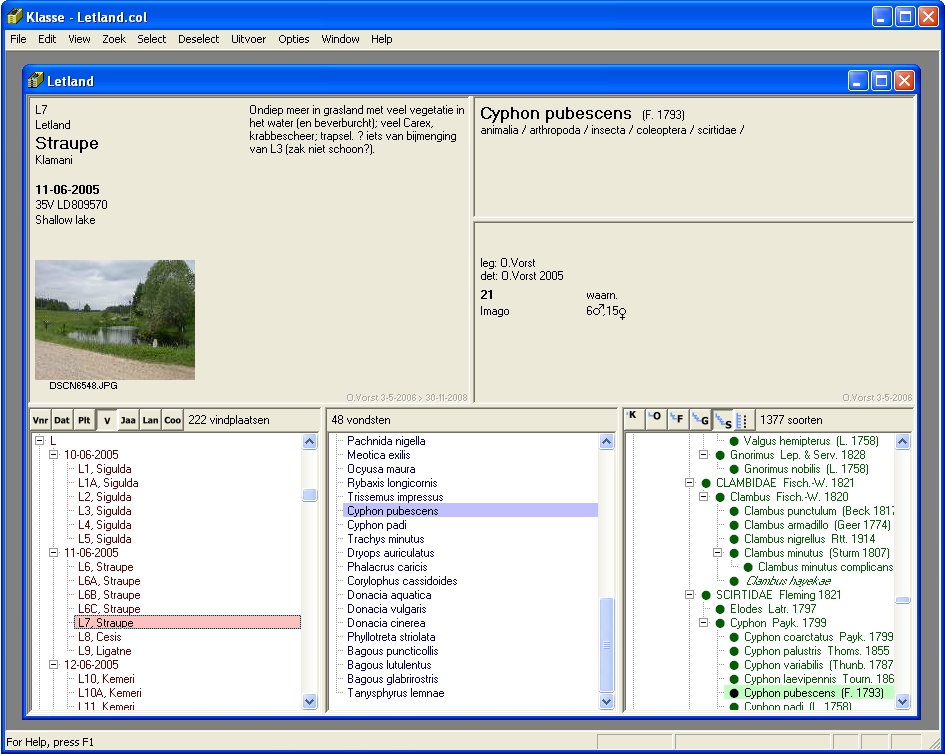 In het blauwe lijstje zijn alle 65 vondsten van deze 15 vindplaatsen samengebracht. Ze blijken te behoren tot 40 verschillende taxa. Op deze manier kun je bijvoorbeeld ook samengevoegde vondstenlijstjes maken per provincie, voor een heel land, maar bijvoorbeeld ook per jaar. Over de in het blauwe lijstje geselecteerde vondst is nog iets bijzonders te melden. Dit exemplaar van Hygrotus impressopunctatus is in deze collectie ooit ingevoerd als Coelambus impressopunctatus. In de catalogus die momenteel in gebruik is, is bekend dat deze namen dezelfde soort aanduiden. Zo heb je dus altijd een blik op je collectie volgens de huidige taxonomische inzichten. Toch blijft ook behouden onder welke naam je de vondst destijds hebt ingevoerd, zodat er nooit informatie verloren gaat. Je kunt naar believen experimenteren met catalogi die andere Klasse-gebruikers gemaakt hebben, en als die niet bevallen altijd weer terugkeren naar de standaard-catalogus. Of je kunt in een zelf-aangepaste catalogus een persoonlijke taxonomische visie erop na houden, en toch je gegevens zonder problemen met andere gebruikers uitwisselen. |