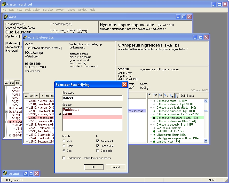 | Van een collectie kun je een selectie maken. Er ontstaat dan een nieuw window, waarin alleen de vindplaatsen en vondsten getoond worden die aan een bepaald criterium voldoen. In het voorbeeld is een selectie gemaakt op een oecologisch kenmerk: alleen de vindplaatsen met biotoop 'bos' zijn geselecteerd. In het selectie-window kun je apart bladeren. Ook kun je vanuit het selectie-window weer een nieuwe selectie maken, zodat er meerdere criteria gecombineerd worden. In het voorbeeld is de gebruiker net bezig om een nieuwe selectie te maken, ditmaal op grond van de aanwezigheid van bepaalde zoekwoorden in de vindplaats-beschrijving. |