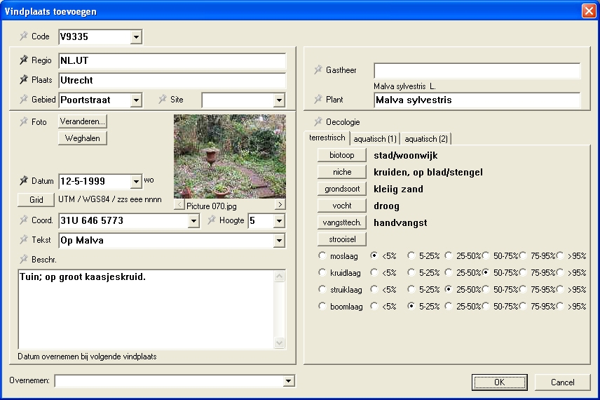 | Nieuwe gegevens kun je invoeren in twee stappen: eerst beschrijf je de vindplaats, en daarna de vondsten die op die vindplaats zijn verzameld en/of waargenomen. Je kunt natuurlijk ook exemplaren uit een museum invoeren; er zal dan meestal maar één vondst per vindplaats zijn. Dit voorbeeld toont het invoerscherm voor vindplaatsen, met velden zoals provincie, plaatsnaam, datum, coördinaten, en oecologische beschrijving: |