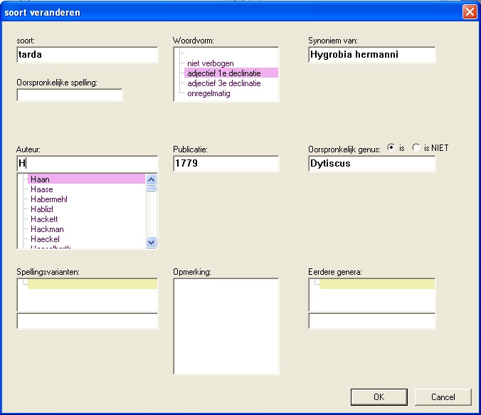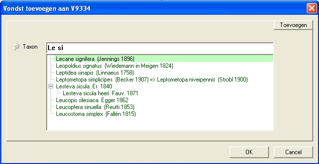 | Het invoeren van een vondst begint met het aanwijzen van een taxon uit de catalogus. Intikken van de eerste paar letters van genus- en/of soortnaam volstaan om het lijstje kandidaten tot een overzichtelijke hoeveelheid te beperken. |