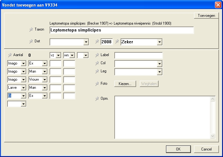 Bij het groepje determinatie-gegevens (Taxon, det, jaar en zekerheid) kun je meerdere determinaties invoeren, bijvoorbeeld om eerdere (onjuiste of onzekere) determinaties ook nog te bewaren. |