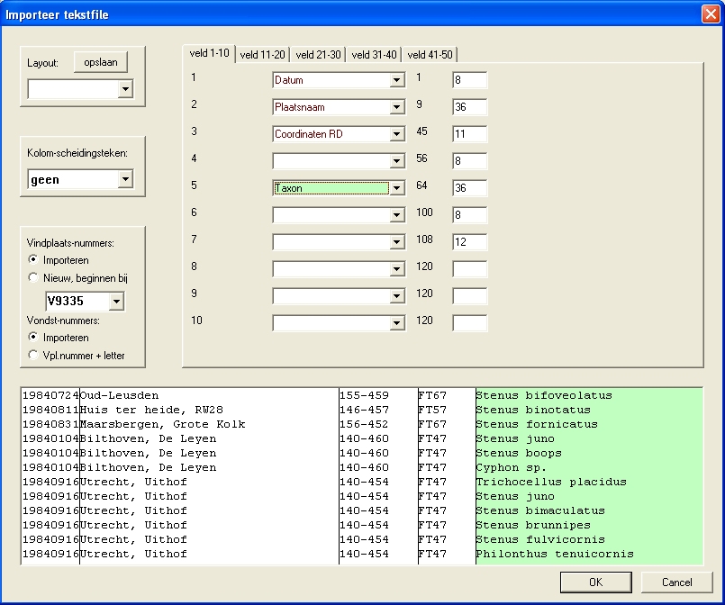 | In het selectie-window bovendien een andere weergave van de lijstjes gekozen: zowel het rode vindplaatsen-lijstje als het groene taxa-lijstje is 'plat' weergegeven. In het groene taxa-lijstje is er ook voor gekozen om niet alleen de taxa van de selectie te tonen (met een grote stip ervoor), maar ook de overige taxa uit de collectie (met een kleine stip) en de taxa uit de catalogus die niet in de collectie voorkomen (met een open stip). |