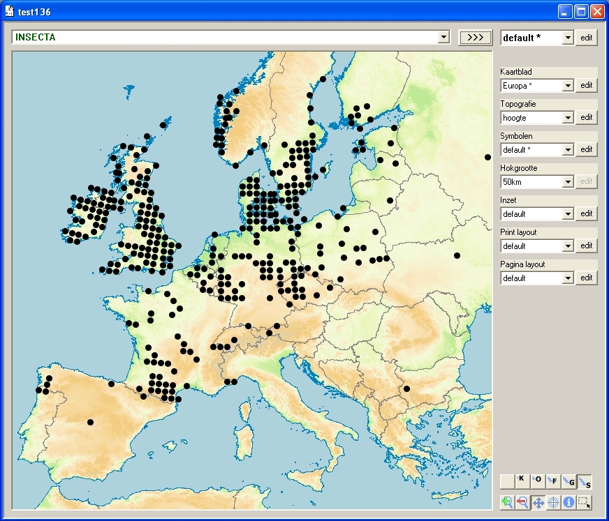 | Als je alle gevens hebt ingevoerd, wil je ze natuurlijk ook overzichtelijk kunnen publiceren. De klassieke manier om verspreiding van soorten weer te geven is een verspreidingskaartje. De spectaculairste utbreiding van Klasse boven Orde is de mogelijkheid om verspreidingskaartjes van Europa te maken: |