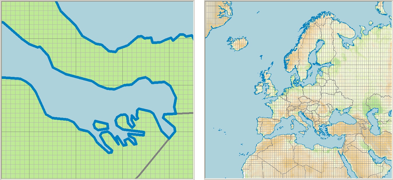Je kunt de kaarten printen, opslaan als BMP en JPG-bestand in resolutie naar keuze, of exporteren voor gebruik in Adobe Illustrator. Je kunt traploos in- en uitzoomen. Het gedekte gebied is Europa met ruime omgeving (40° West tot 60° Oost, 20° tot 90° Noord). Het mogelijke detailnivo wordt aangegeven in onderstaand fragment van Zeeland: |