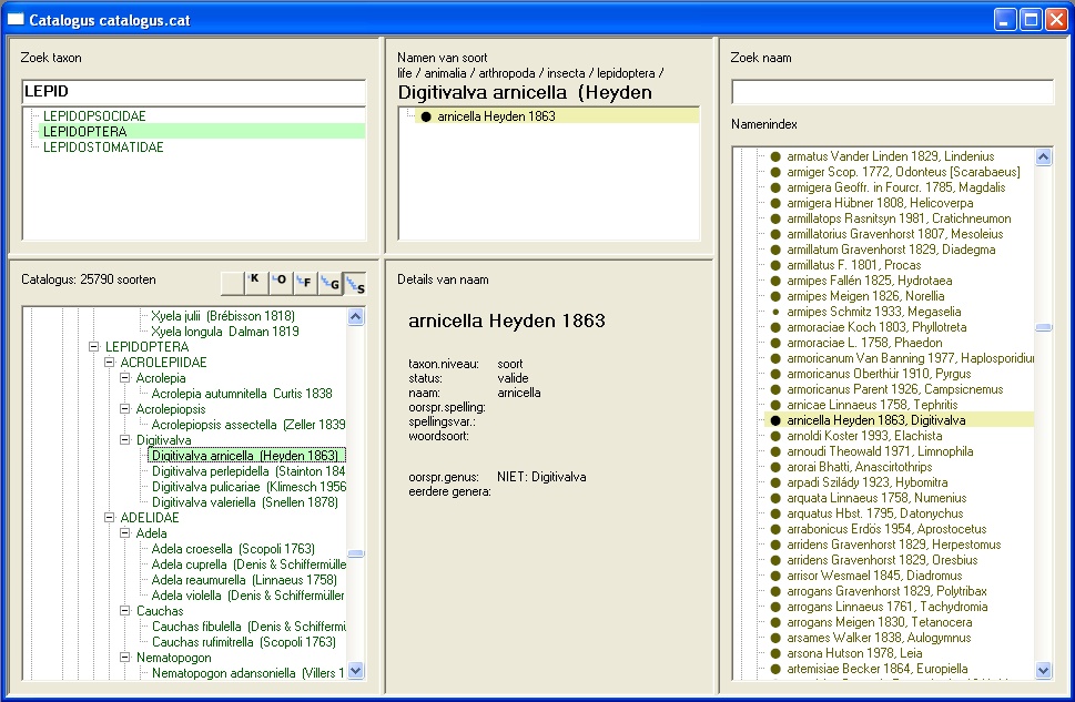 Qua uiterlijk lijkt het catalagus-scherm enigszins op het hoofdscherm, maar het doel is geheel anders. Links is een lijst zichtbaar met de gewenste opvatting van de hiërarchie in de taxa, rechts is een alfabetische lijst van alle soortgroep-, genusgroep-, familiegroep- en hogere namen zichtbaar. In de taxonomie kunnen taxa met drag&drop verplaats worden. |