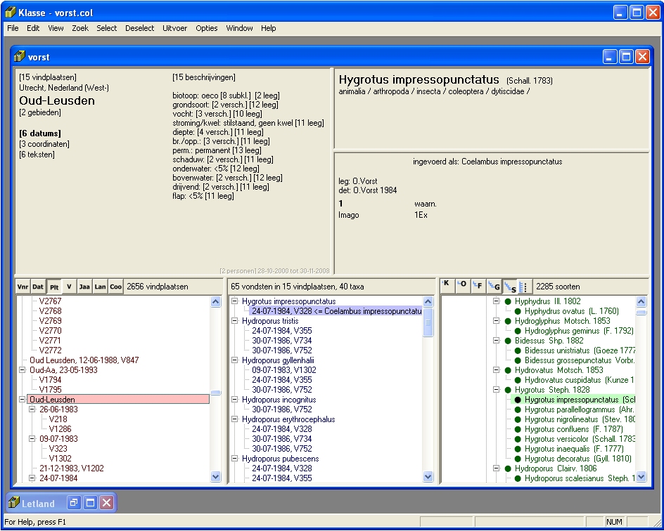 In het blauwe lijstje zijn alle 65 vondsten van deze 15 vindplaatsen samengebracht. Ze blijken te behoren tot 40 verschillende taxa. Op deze manier kun je bijvoorbeeld ook samengevoegde vondstenlijstjes maken per provincie, voor een heel land, maar bijvoorbeeld ook per jaar. Over de in het blauwe lijstje geselecteerde vondst is nog iets bijzonders te melden. Dit exemplaar van Hygrotus impressopunctatus is in deze collectie ooit ingevoerd als Coelambus impressopunctatus. In de catalogus die momenteel in gebruik is, is bekend dat deze namen dezelfde soort aanduiden. Zo heb je dus altijd een blik op je collectie volgens de huidige taxonomische inzichten. Toch blijft ook behouden onder welke naam je de vondst destijds hebt ingevoerd, zodat er nooit informatie verloren gaat. Je kunt naar believen experimenteren met catalogi die andere Klasse-gebruikers gemaakt hebben, en als die niet bevallen altijd weer terugkeren naar de standaard-catalogus. Of je kunt in een zelf-aangepaste catalogus een persoonlijke taxonomische visie erop na houden, en toch je gegevens zonder problemen met andere gebruikers uitwisselen. |