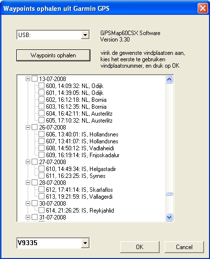 Je kunt dan de gewenste waypoints aanvinken. Klasse haalt de coördinaten (en bij sommige modellen ook datum en tijd) op uit de GPS, en vult die uit z'n eigen kennis aan met land en plaatsnaam. Heb je geen GPS? Geen nood: wijs je vindplaatsen aan in Google Earth, bewaar de punten als Google's KML-file, en importeer die in Klasse. Ook kan Klasse WPT-files van OziExplorer lezen. |
