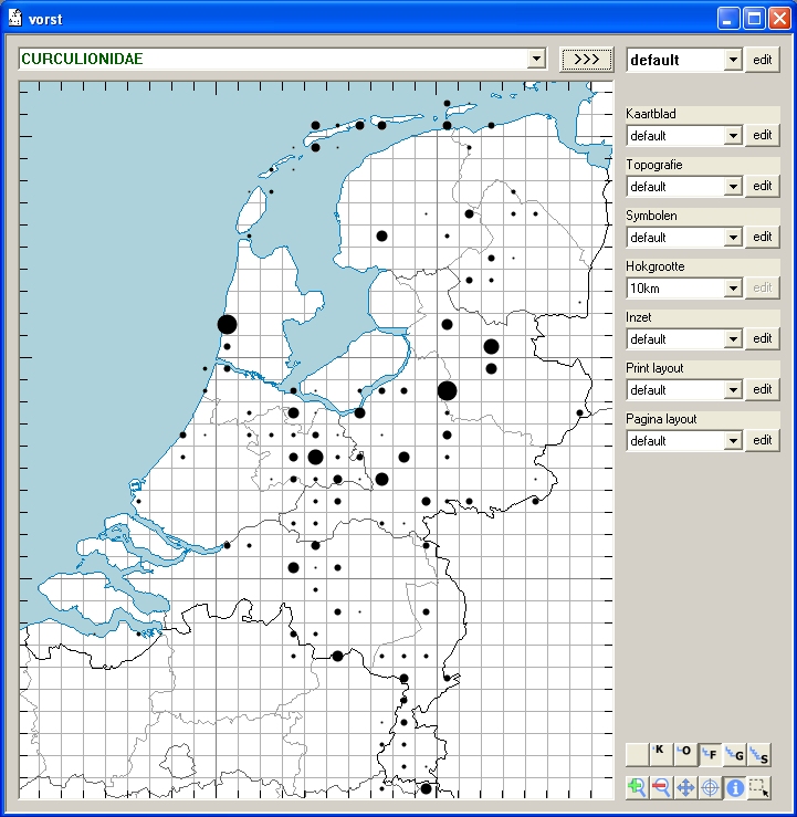 | Als je alle gevens hebt ingevoerd, wil je ze natuurlijk ook overzichtelijk kunnen publiceren. De klassieke manier om verspreiding van soorten weer te geven is een verspreidingskaartje. De spectaculairste utbreiding van Klasse boven Orde is de mogelijkheid om verspreidingskaartjes van Europa te maken: |